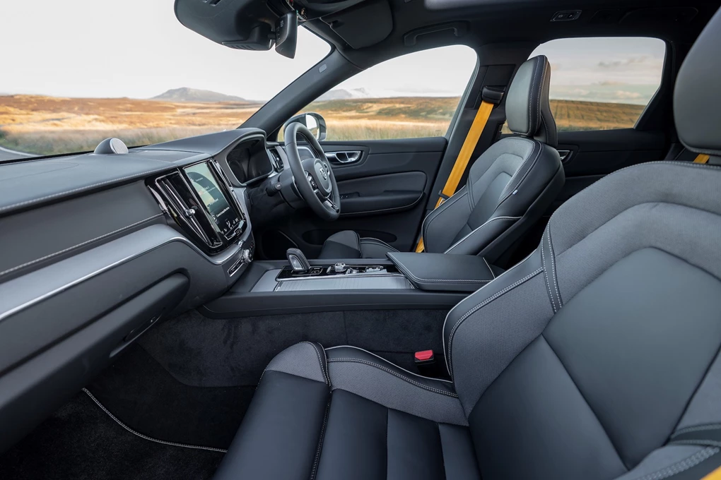 On the interior, the XC60 takes more of a premium approach than a sporty one. Volvo interiors are some of the best around, and this one is a wonderful place to spend time. The quality is excellent, with this Polestar Engineered version getting some lovely aluminium and leather accents, along with the vibrant gold-coloured seatbelts, which successfully add a bit of character. The nine-inch touchscreen is also clean and modern, and while being a bit fussy to use at first, you soon get used to it.